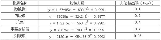 在本方法確定的實(shí)驗條件下,移取1.0uL 3.4配置好的有機磷標準工作溶液,進(jìn)樣檢測,將所得各個(gè)組分的峰面積與相應濃度進(jìn)行線(xiàn)性回歸,得各個(gè)組分的線(xiàn)性回歸方程。同時(shí)計算各個(gè)組分的檢出限,相關(guān)結果見(jiàn)下表: